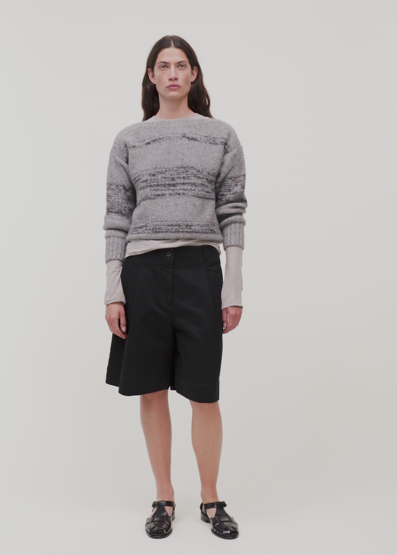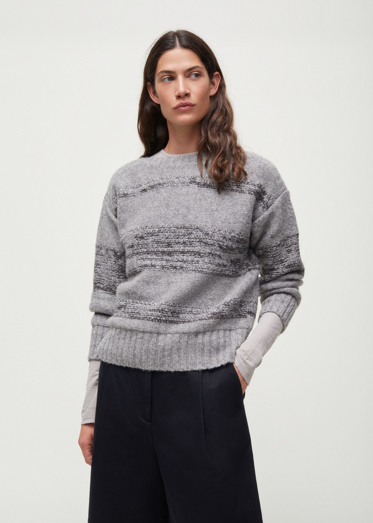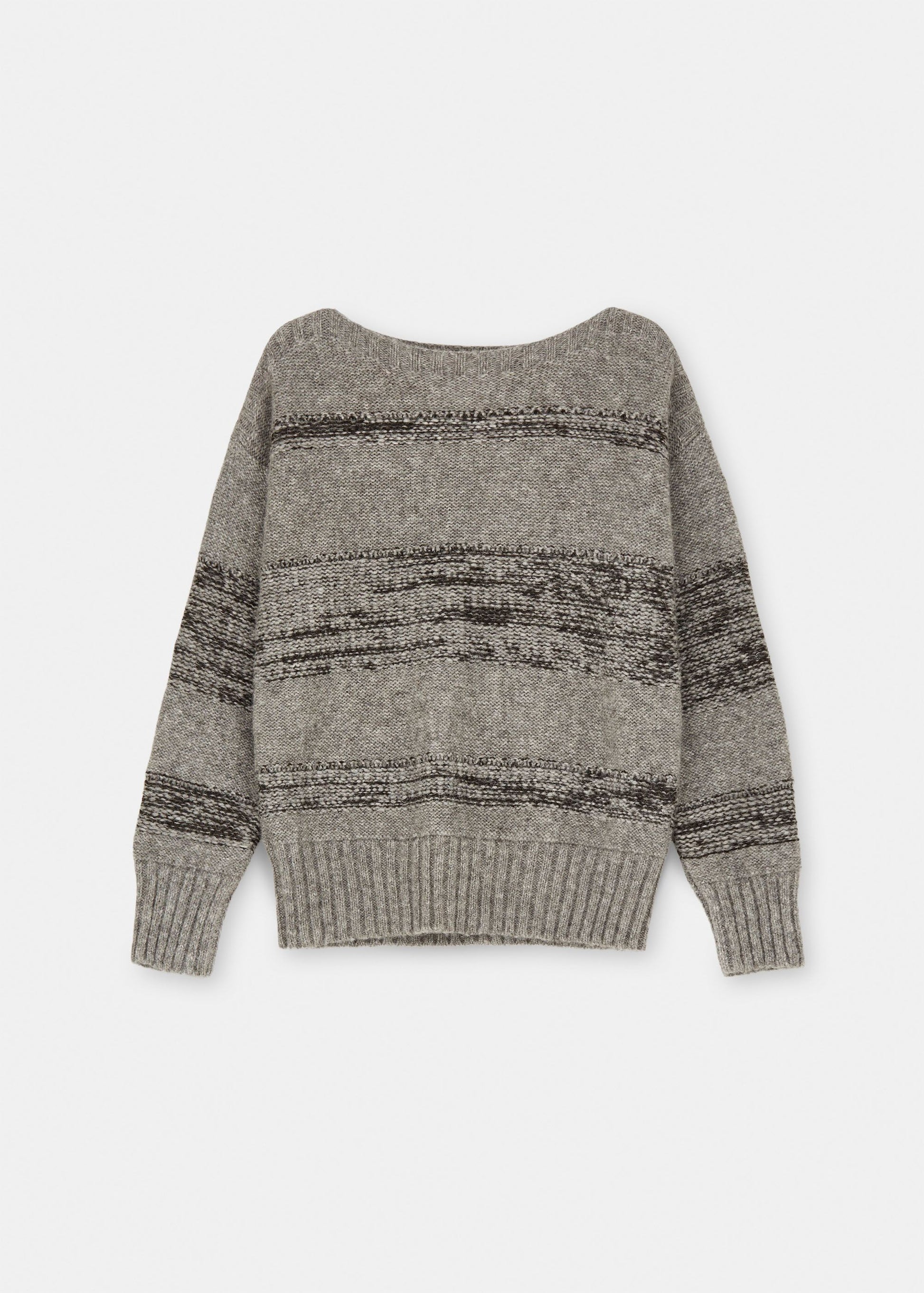 Aiayu skriver; Brooke is a soft and fluffy sweater crafted from a premium blend of llama and highland wool. It features a visible mélange weave, subtle eyelet hole detailing and ribbed trims along its neckline and sleeves. Brooke sweater has a classic, slightly boxy fit with dropped shoulders and boat neck.