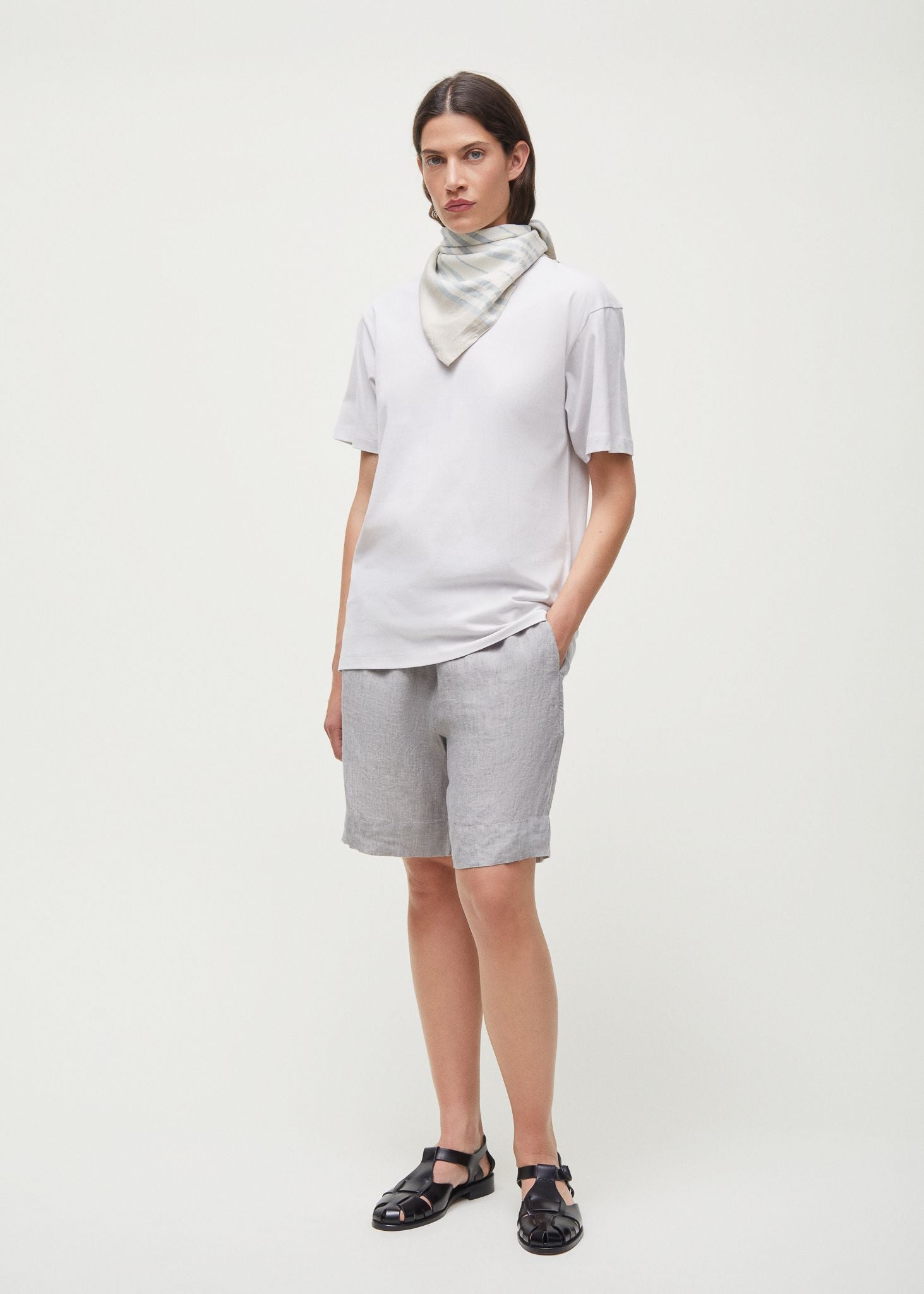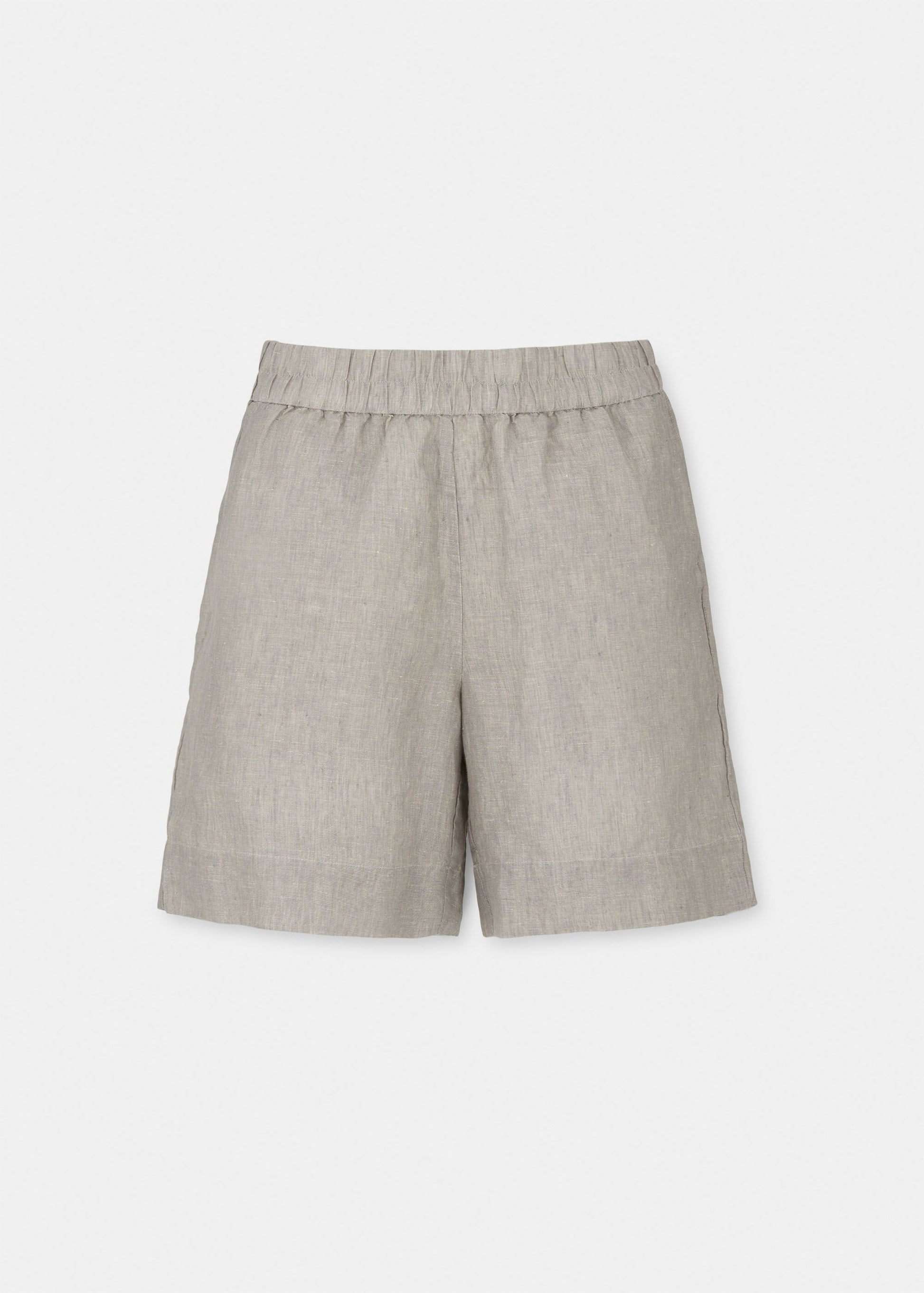 Aiayu skriver; Shorts long linen has a relaxed fit with Bermuda-inspired length. Crafted from a breathable European linen weaved in a mix between yarn-dyed and undyed threads for a subtle melange effect. The shorts feature an elastic waistband, slanted pockets, and a wide hem. A light and versatile item for when the weather warms.