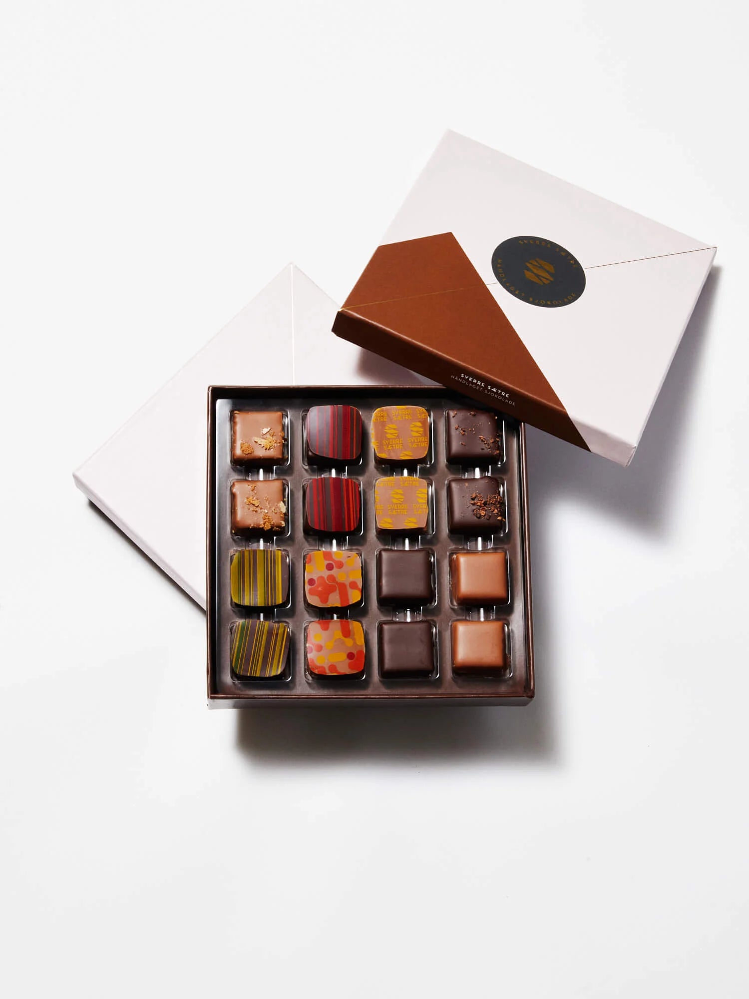 16 håndlagde konfektbiter i en fin gaveeske. All vår konfekt er ferskvare – fra produksjonsdato er sjokoladen best i 5-7 uker. (Hentet nylaget hos Sverre 14/11)