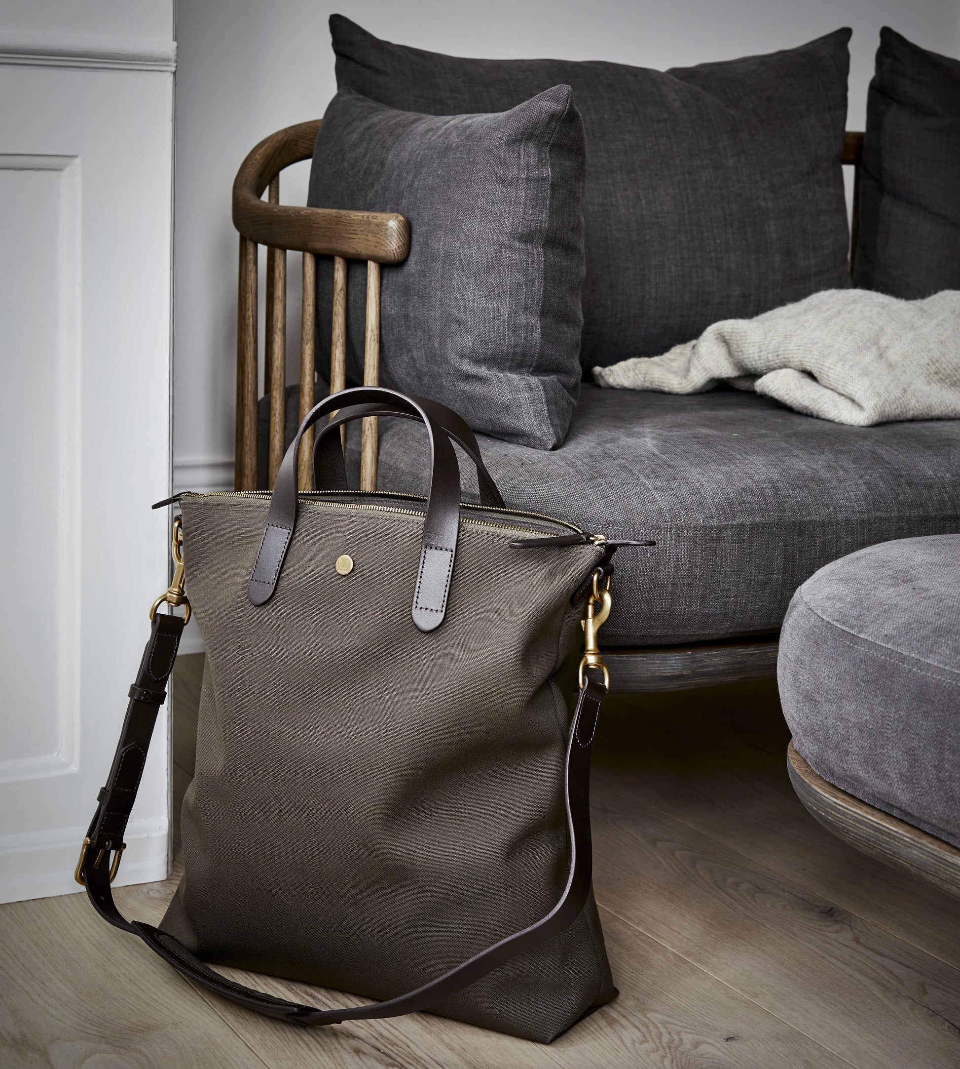 Army Canvas; A mainstay of the Mismo collection, the Army canvas was the first fabric introduced in 2008. Set on a cotton warp and nylon weft, the canvas offers the better of two worlds; the tactility of the cotton and the durability of the nylon. With its earthy blend of grey, green, and brown, the canvas carries a sense of heritage - rooted in nature and tradition, its tones recalling open landscapes, weathered field jackets, and a quiet, enduring elegance.