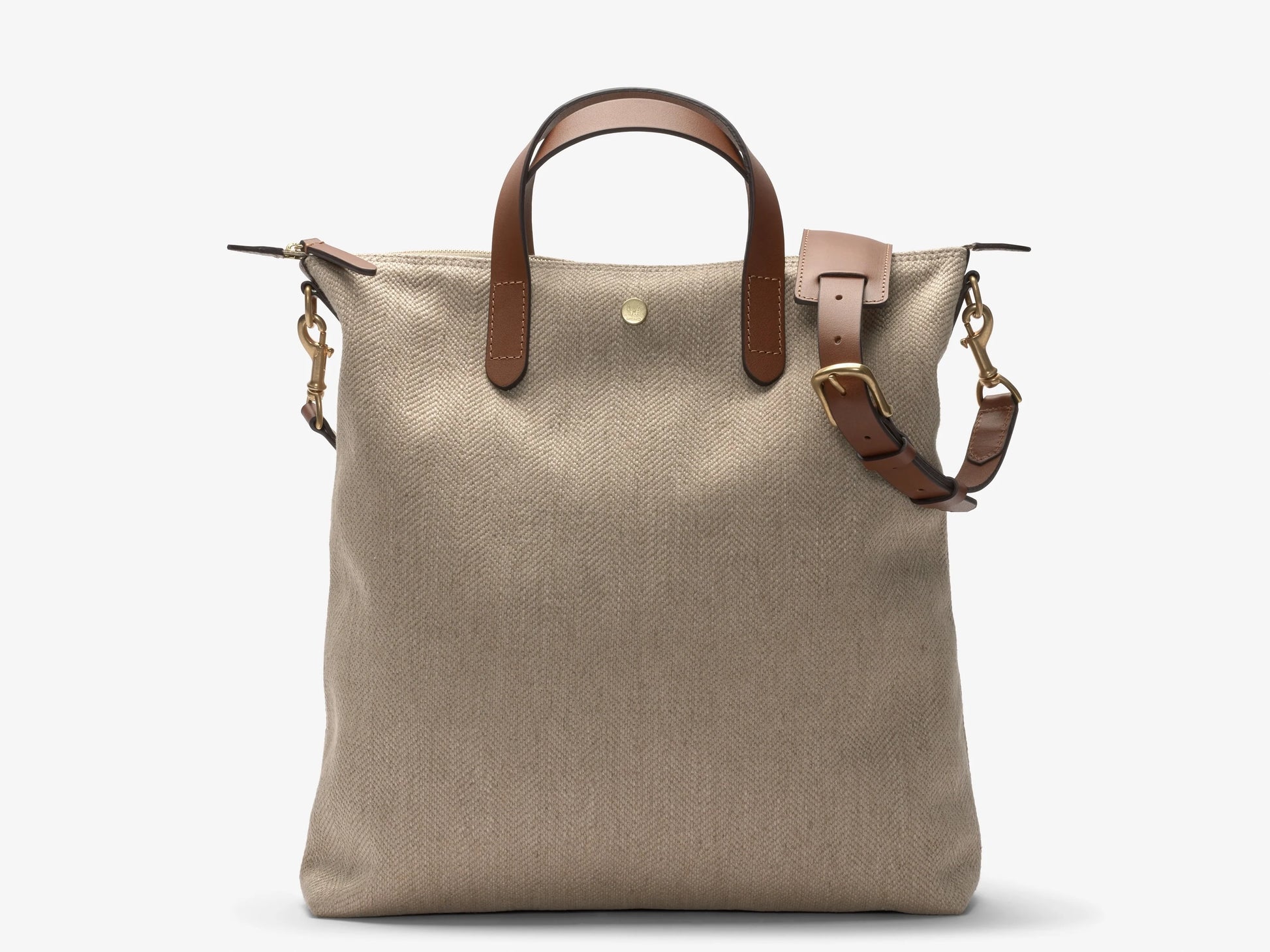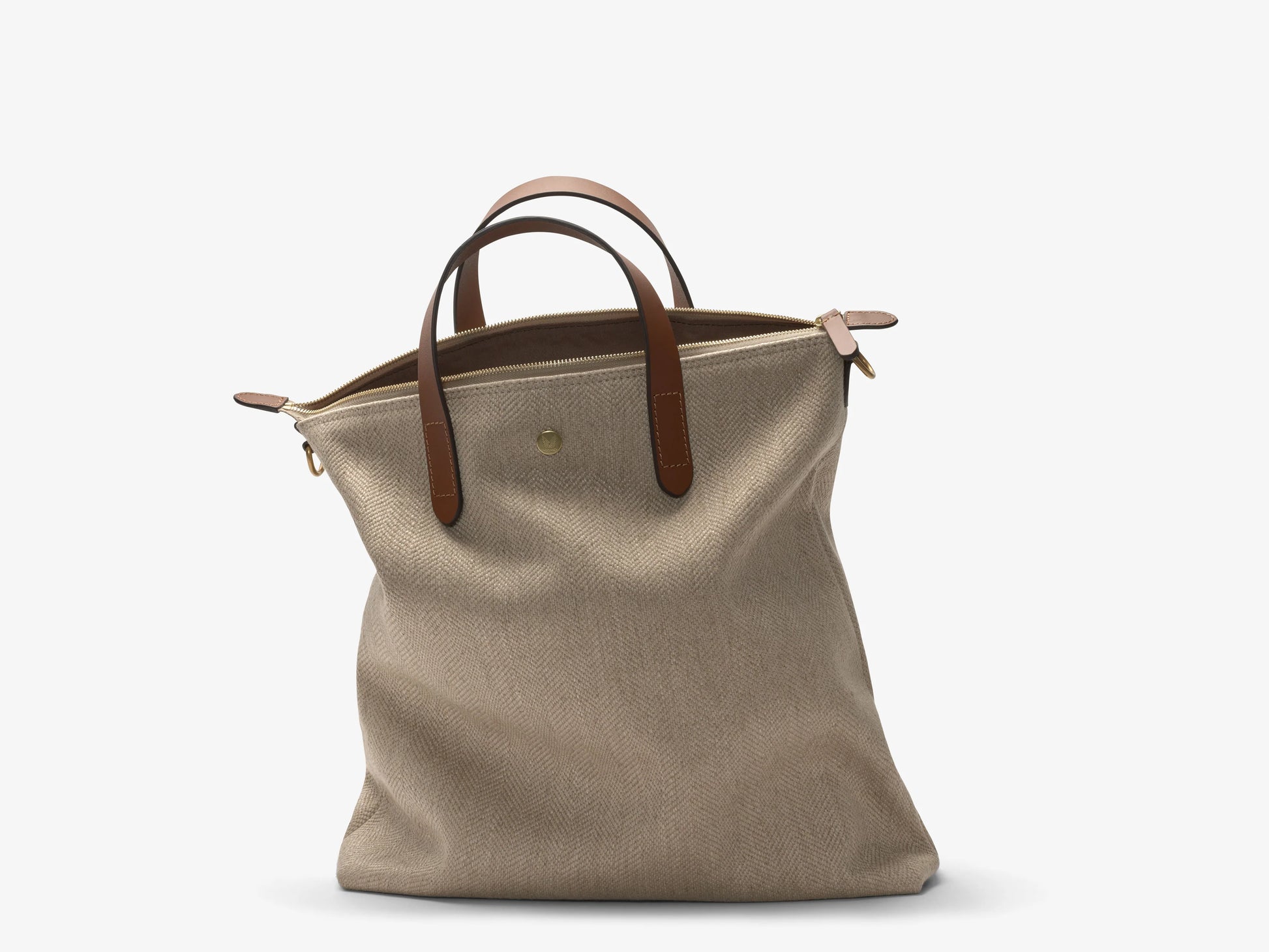 Material; Linen herringbone JacquardFull-grain bridle leather trimSolid brass accessories