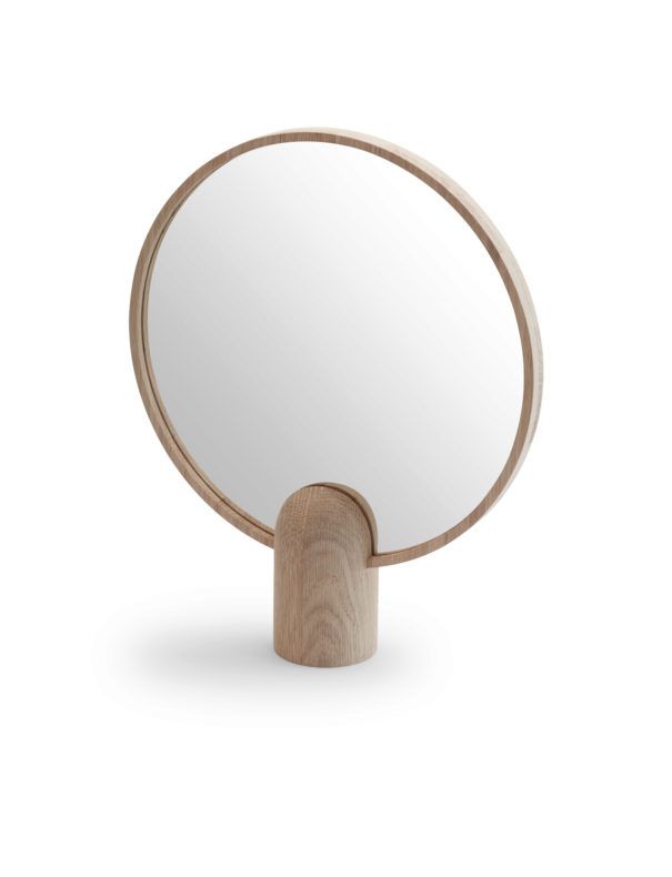 Aino is a double-faced mirror in light oak – eye-catching and sculptural in its design. The round frame is wedged into a wooden base so it can stand as a decorative accessory on any surface. Aino looks great on a dresser, shelf or cabinet next to a small plant or lamp.