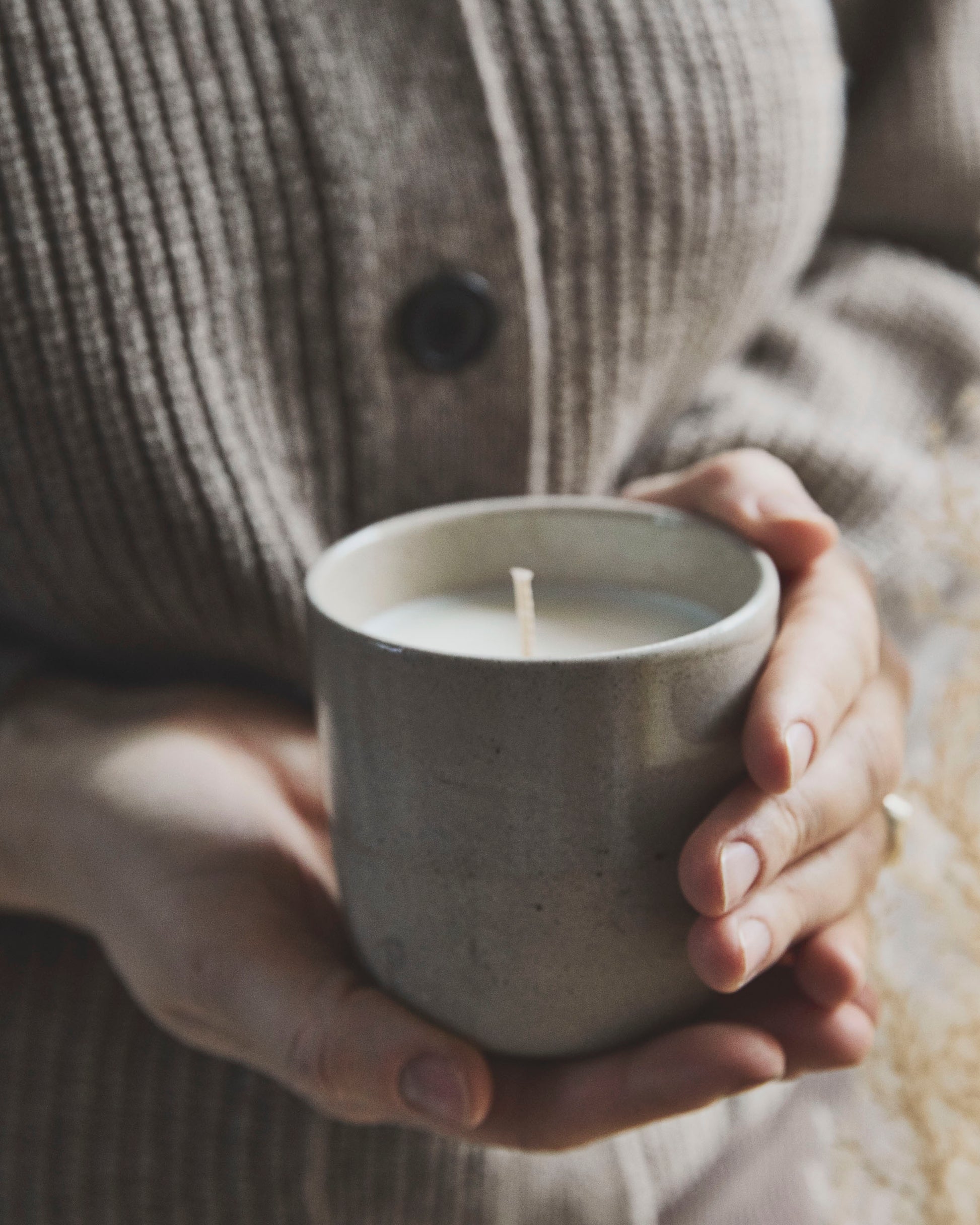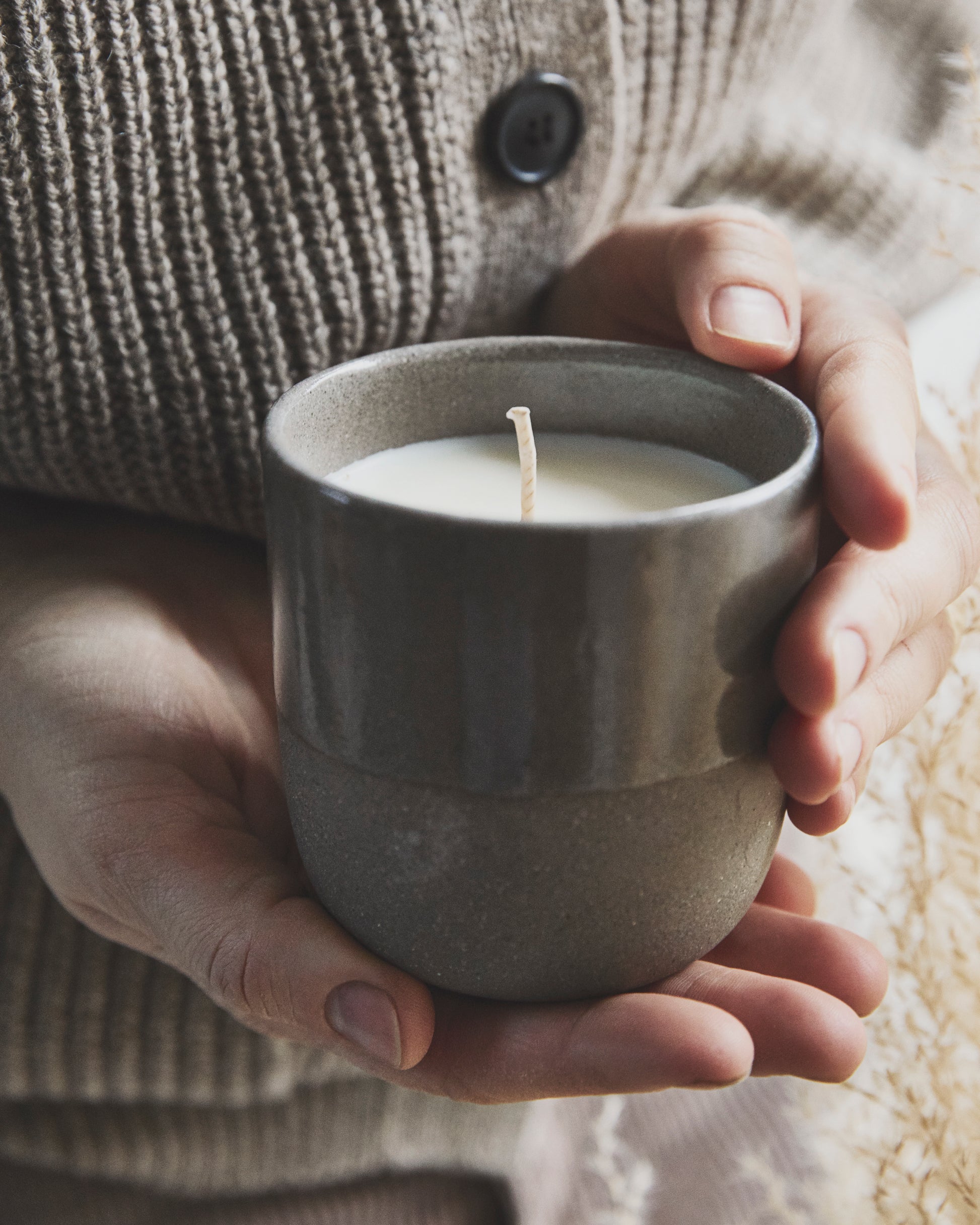 Keramikkoppene er fra Odd Standard, som produserer i Stavanger. Koppene er egentlig kaffe/te- og espressokopper, så du kan bruke dem videre når lyset er brent ned – eller levere dem tilbake til oss og betale et mellomlegg for å få nye lys.